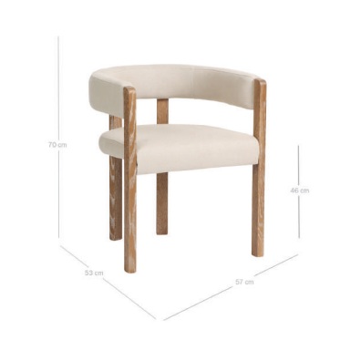 Preciosa silla, de diseño moderno e inspiración nórdica, con estructura de formas curvas en madera de roble acabado natural y asiento y respaldo tapizados en elegante lino beige.