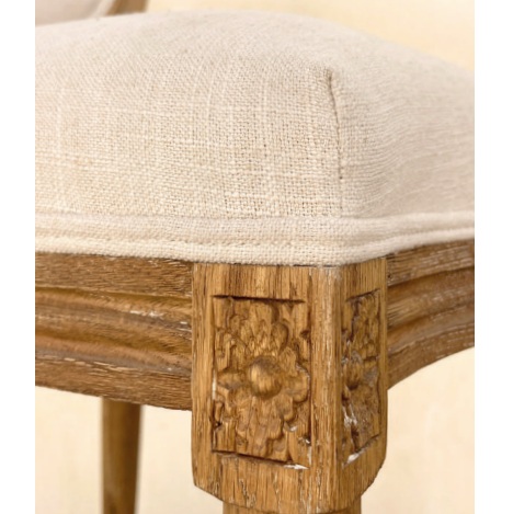 Elegante silla de estilo clásico con estructura tallada y torneada de madera de roble tapizada en lino beige.