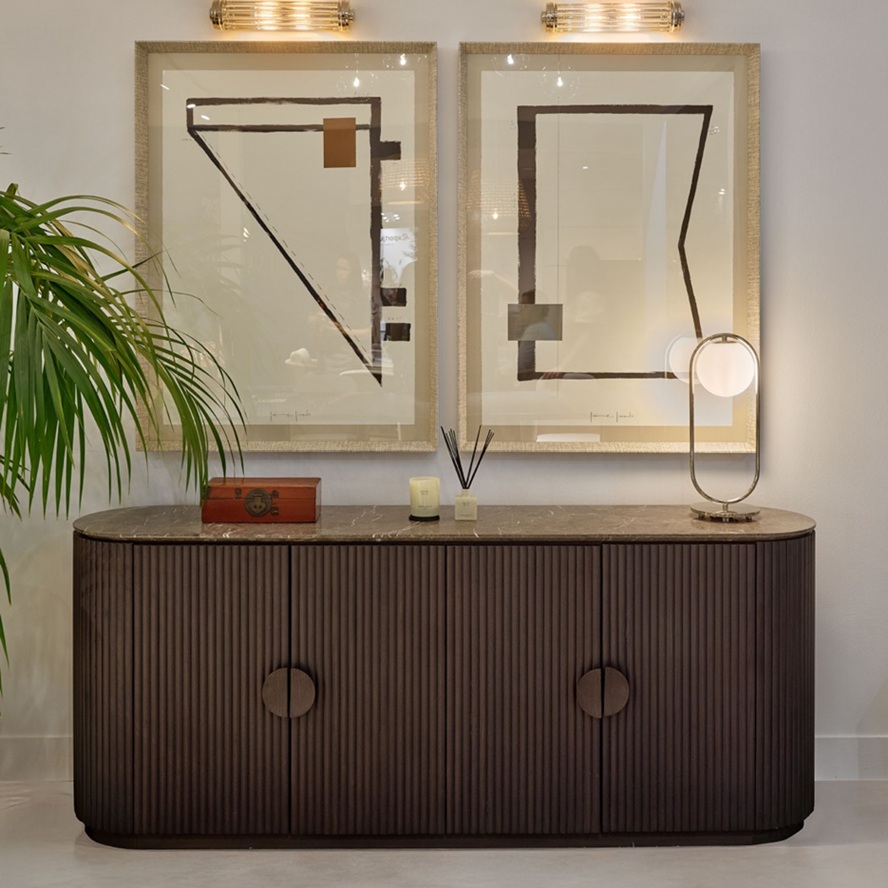 Espectacular aparador de gran tamaño, de diseño moderno e inspiración Art Decó, fabricado en madera de fresno acabado oscuro con contorno en palillería y elegante sobre de mármol gris.