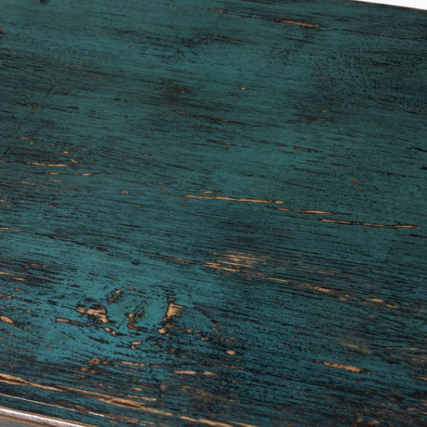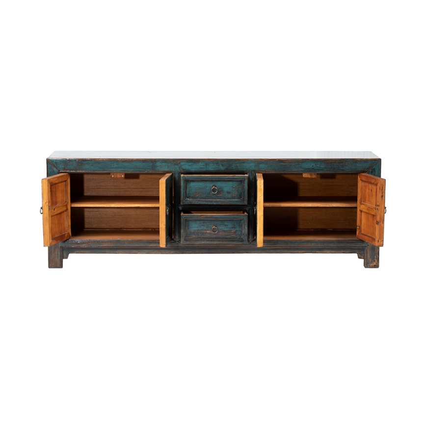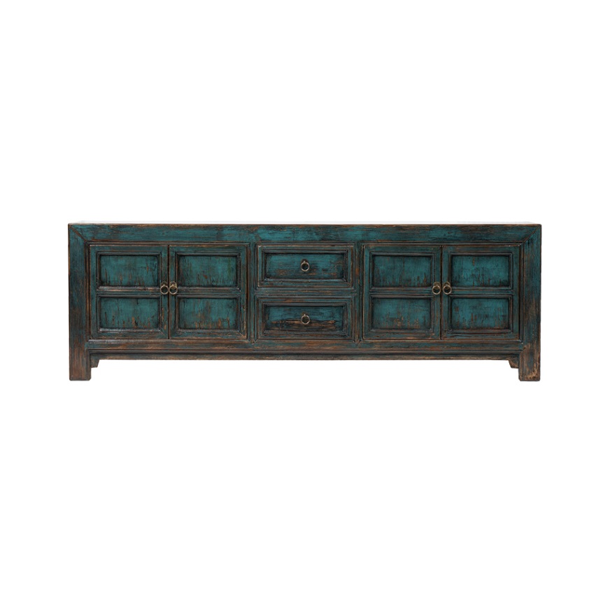Precioso y original mueble de televisión de diseño oriental fabricado en madera de pino con bonito acabado en color azul y marcados desgastes.