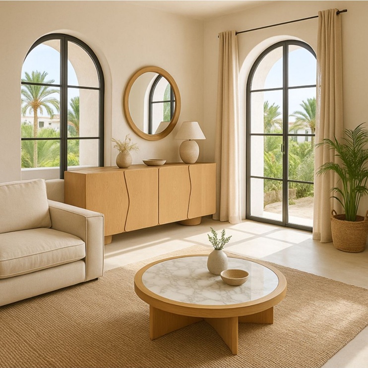 Exclusiva mesa de centro redonda, de diseño moderno, con original estructura de madera de roble en color claro y precioso sobre de mármol blanco.